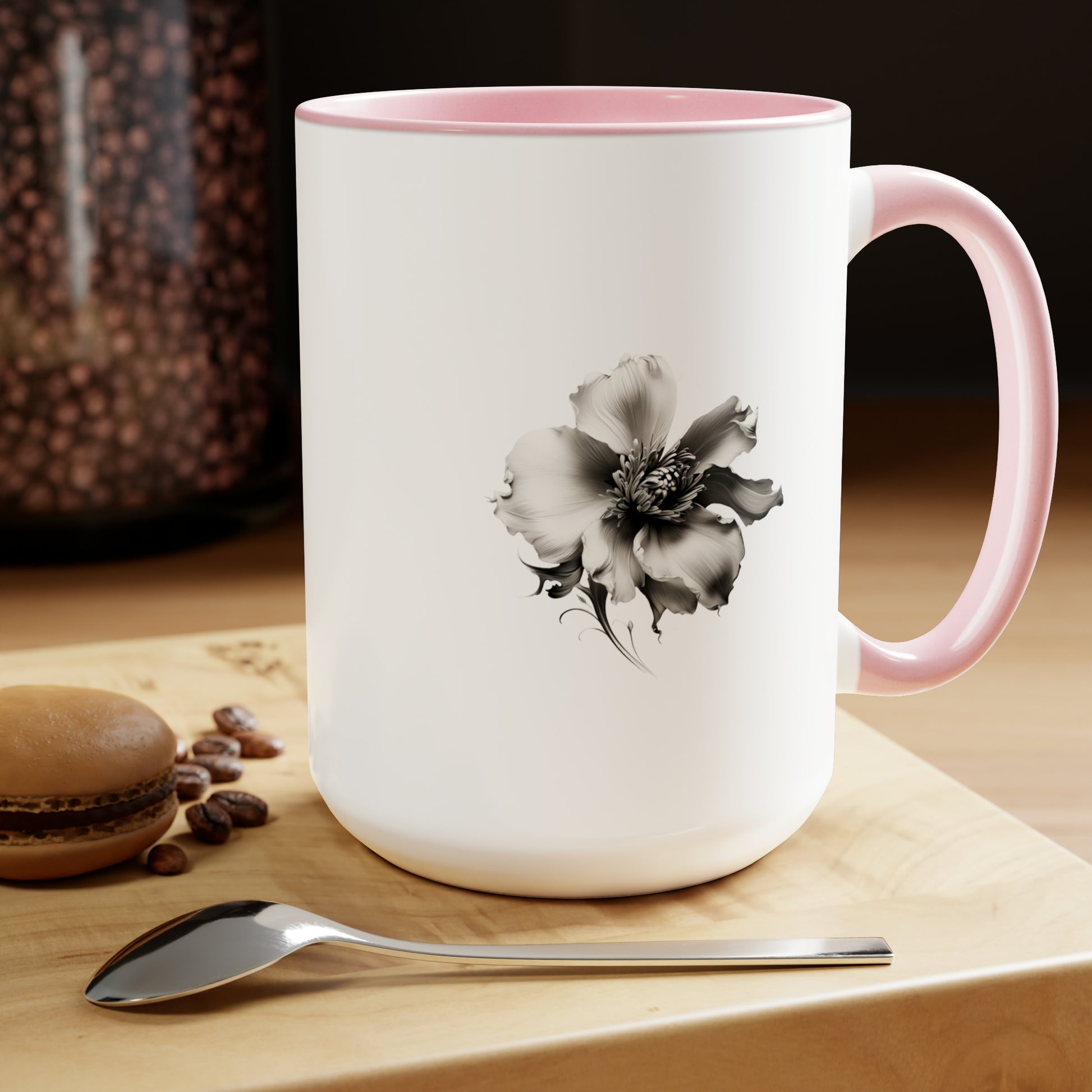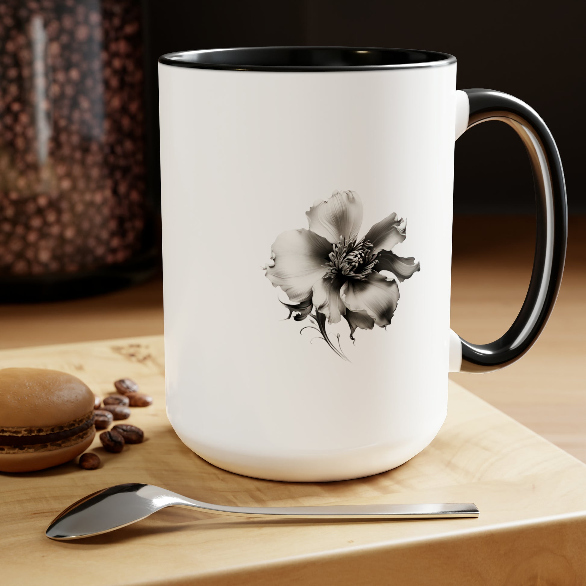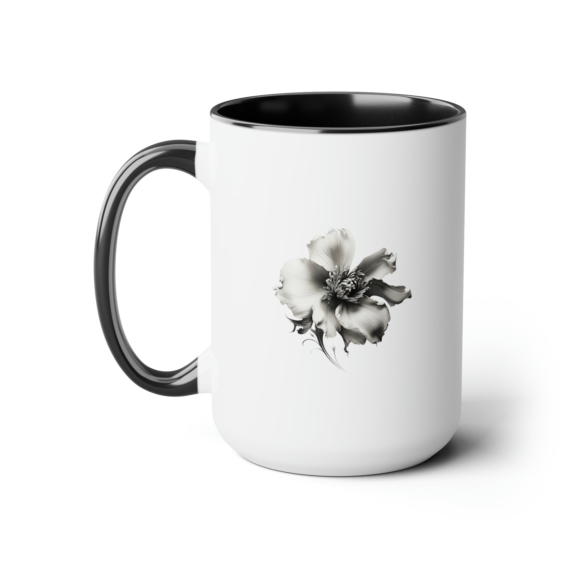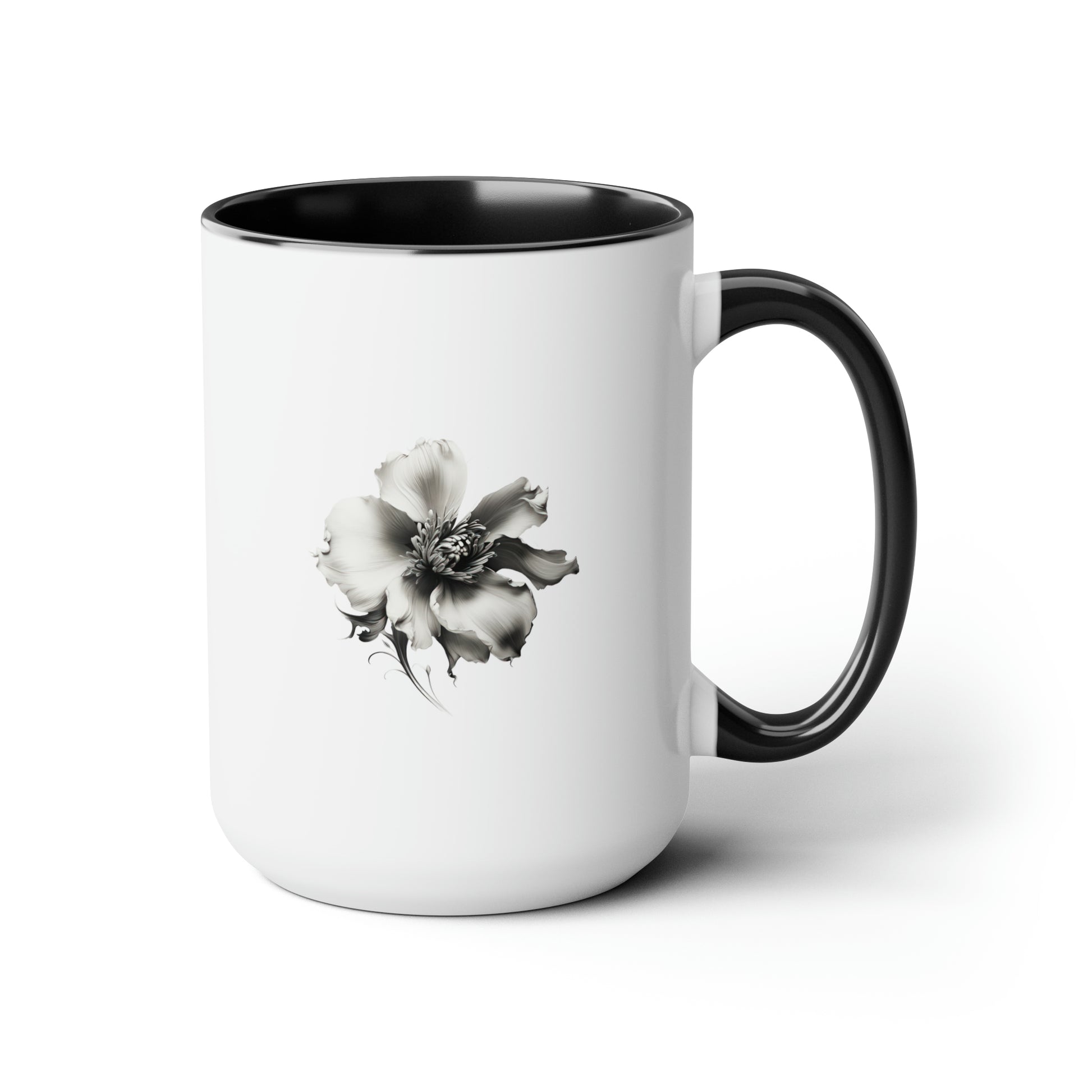 Double-Sided Flower, Greyscale, Two-Tone Coffee Mugs, 15oz
